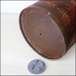 I bought this can in rainy conditions, and to be honest, the wetness disguised many of its issues. This great-looking old can was found with a grim appearance, but it definitely has potential. The can was found to be structurally sound, it sat straight and true and had its original cast alloy screw in lid. The can itself is made from heavy-gauge steel with reinforced joints and double-thickness seams.